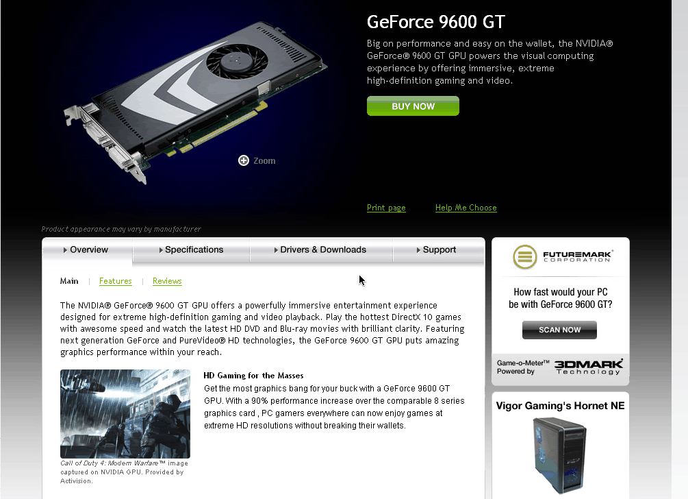 I don’t really mind, as I said I only want to play on low-med settings. Currently I am using an on board Intel GMA 950:( Any I don’t really care about the res, firstly because the screen that im playing on isn’t that big and secondly I don’t mind if it is a bit under quality) After using the GMA all I really want now is something that will at least PLAY the game even on low settings. Also, the RECOMMENDED sytem requirements for COD4 is 1 GB of ram and an Nvidia GeForce 7800 Im getting 2 gigs of ram a 3Ghz dual processor and a Geforce 9600.Here is a screen shot of the Nvidia 9600 website (NVIDIA GeForce 9600 GT ) It shows COD4 as an exaple of the 9600 HD gaming capability. http://i522.photobucket.com/albums/w346/0Firehawk0/ScreenHunter_02Aug190942.gif