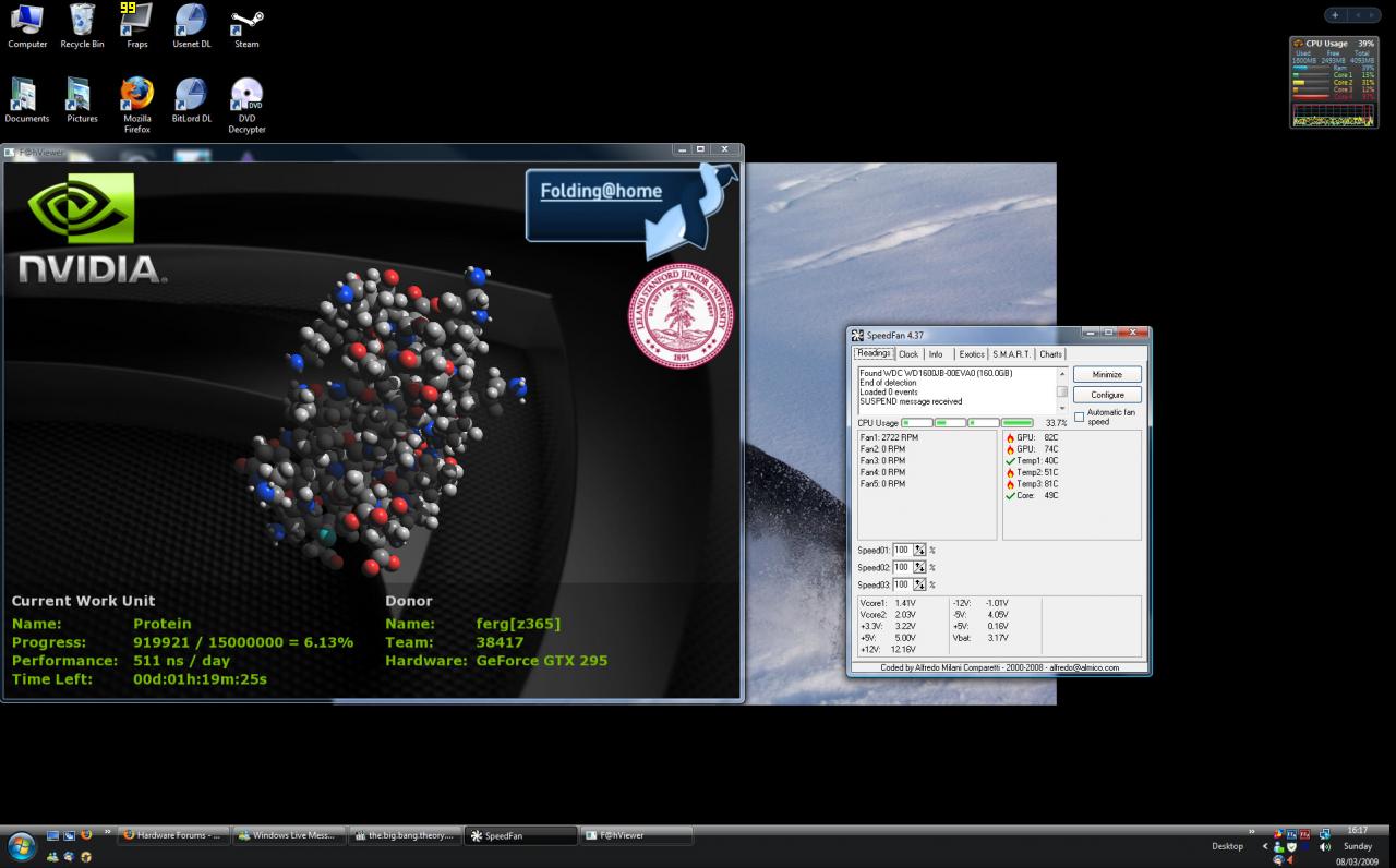 Just running it now and I can see that it is burning up in my GTX 295 pushing both the cores right up to full load temperatures while it seems to be using core 4 on my CPU only.