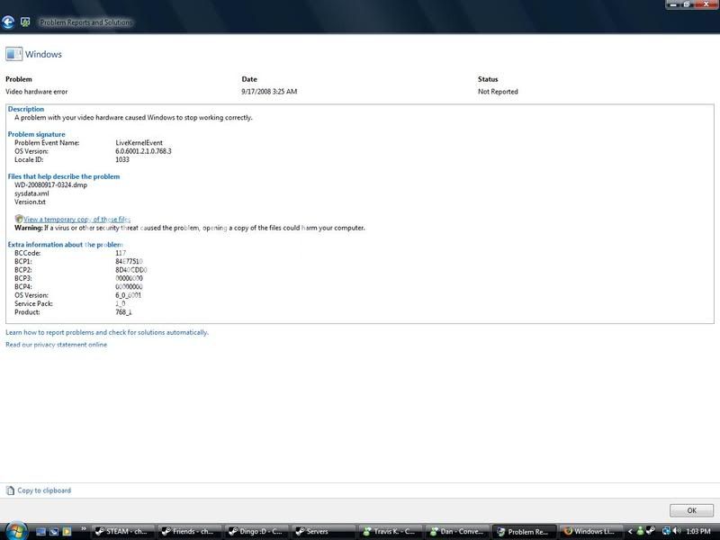 Below is a image of the error report I get in Vista’s problems and solutions center, not sure if it is of any help in helping me sort this problem out but who knows.
