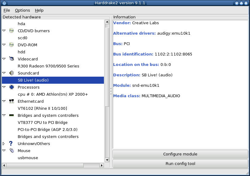 OK, now that we have Hard Drake up, find your sound card on the list. If it’s been detected, it’ll be under the Soundcard subheading. If not, it’ll be under Unknown/Others. Select the soundcard, and click Run Config Tool. Next click the Driver dropdown menu and choose ap appropriate driver. If you have a Live! card, choose the ALSA driver (snd-emu10k1). If you have an Audigy/Audigy2, choose the ALSA Audigy driver (audigy).